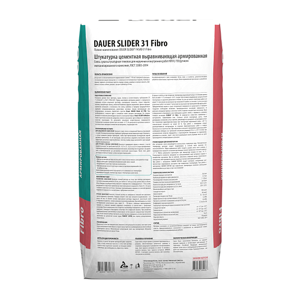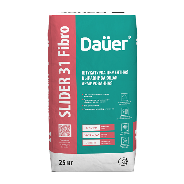 Штукатурка цементная: SLIDER® FASAD 31 Fibro выравнивающая армированная, упаковка 25 кг